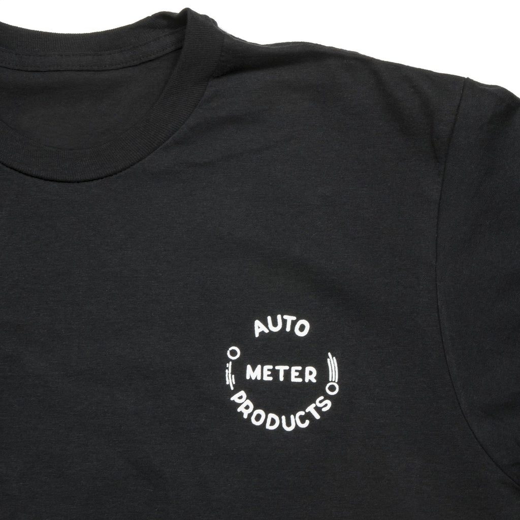 This vintage shirt design from the team at AutoMeter remembers their roots. This 100% cotton, black shirt with sewn fabric hem tag detail features a screened white original 1950s logo graphic on the left chest, and a large Since 1957 white screened graphic on the back showcasing one of the companys original tachometer designs