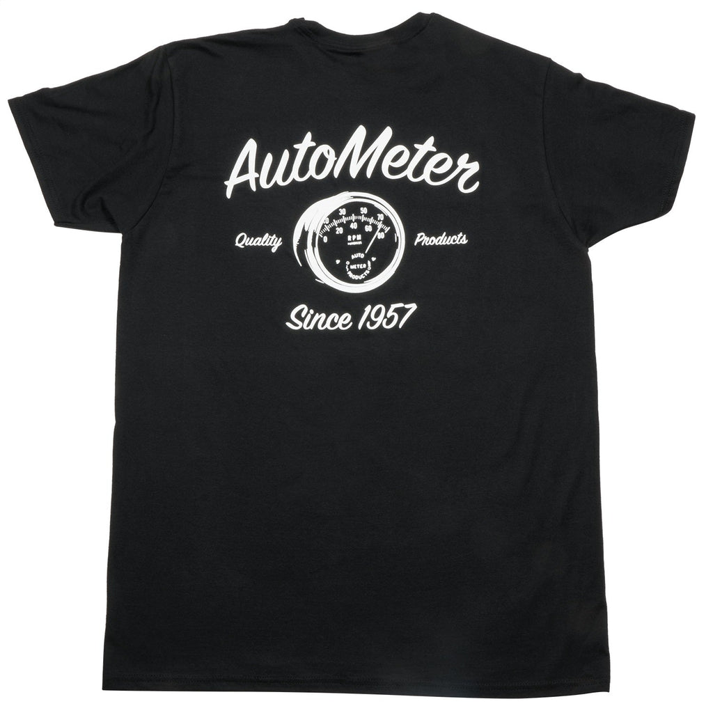 This vintage shirt design from the team at AutoMeter remembers their roots. This 100% cotton, black shirt with sewn fabric hem tag detail features a screened white original 1950s logo graphic on the left chest, and a large Since 1957 white screened graphic on the back showcasing one of the companys original tachometer designs