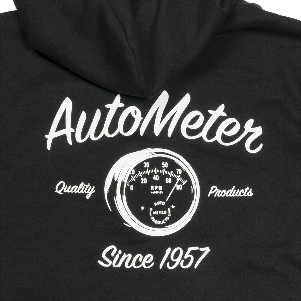 Rock out in a harmonizing blend of warmth and layerability in this vintage styled black fleece zip hoodie from AutoMeter featuring a sewn fabric tag detail on left pocket, a screened white original 1950s logo graphic on left chest, and large Since 1957 white screened graphic on the back showcasing one of the companys original tachometers