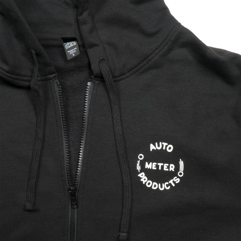 Rock out in a harmonizing blend of warmth and layerability in this vintage styled black fleece zip hoodie from AutoMeter featuring a sewn fabric tag detail on left pocket, a screened white original 1950s logo graphic on left chest, and large Since 1957 white screened graphic on the back showcasing one of the companys original tachometers