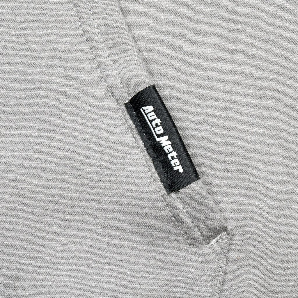 This gray fleece hoodie from AutoMeter will keep you toasty on those chilly mornings and evenings at the track. Features include a sewn fabric tag detail on left pocket, a screened black competition logo graphic on left chest, and large competition logo graphic on the back with contrasting black hood lining and drawstrings.