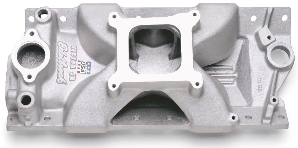 Edelbrock part #2975 Victor Jr. intake manifold is excellent for many applications from drag to circle track racing. This intake manifold provides maximum performance for engines with standard port location, iron and aluminum cylinder heads. The low-profile of the #2975 works well in applications with minimal hood clearance and where 1" or 2" spacers can be used for performance tuning. When carb spacers are not allowed, the #2999 should be used. The Edelbrock Victor Jr. #2975 is a single-plane, high-rise intake designed for maximum race-winning power at higher engine speeds.