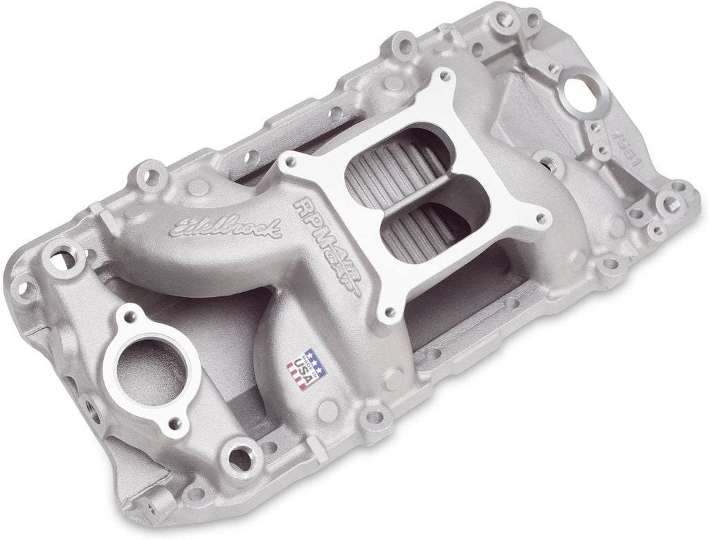 Edelbrock part #7561 RPM Air-Gap 2-O intake manifold is designed for street 396-502 c.i.d. Chevy V8's with large oval-port cylinder heads (1975 and earlier) or Edelbrock Performer/Performer RPM heads. This RPM Air-Gap incorporates the same race-winning technology that's been used on our Victor Series competition intakes for decades. The Air-Gap design features an open air space that separates the runners from the hot engine oil resulting in a cooler, denser charge for more power. Includes rear water outlets, two distributor clamp locations and nitrous bosses. Accepts all late model alternator and A/C brackets for the street. For square bore carburetors only. Will not fit under stock hood of Corvette, 1964-67 Chevelle or 1967-81 Camaro. No provision for exhaust heated chokes and no exhaust crossover.