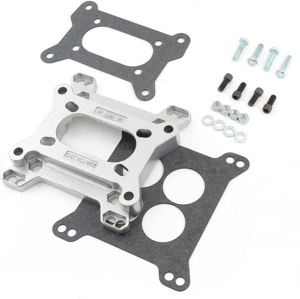 This Mr. Gasket Carburetor Adapter Kit adapter 4-bolt, 4-barrel carburetors to 4-bolt, 2-barrel intake manifolds or 4-bolt, 2-barrel carburetors to 4-bolt, 4-barrel intake manifolds. It is die-cast aluminum, 1 inch thick with an open center. Installs simply between the intake manifold and the carb. Gaskets, bolts, nuts and washers included.