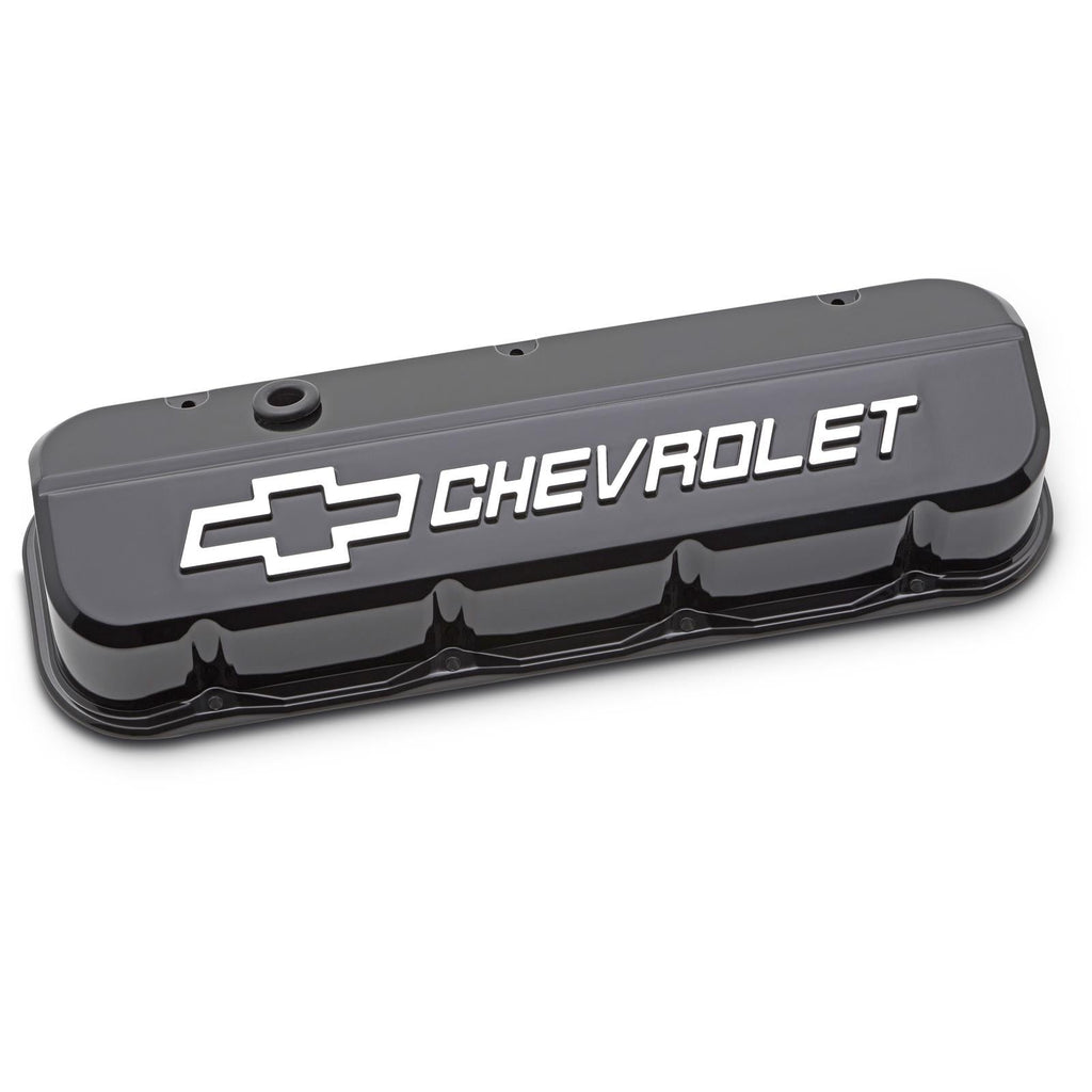 Valve Covers, Slant Edge, Tall, Perimeter Bolt, Cast Aluminum, Gloss Black Powdercoated, Chevrolet Logo Top Style, Chevrolet, Big Block, Pair